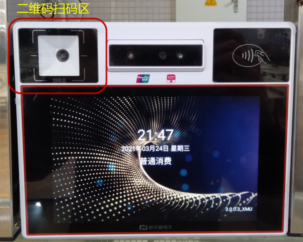 用户在云闪付APP 成功申领“厦大数字校园卡”后,可在校内食堂消费,将 “厦大数字校园卡”二维码(如图4)或云闪付付款码(如图6),贴近售卖窗口POS机的扫码区(如图7)即可完成支付,支付金额从云闪付APP绑定的银联卡余额中扣除。